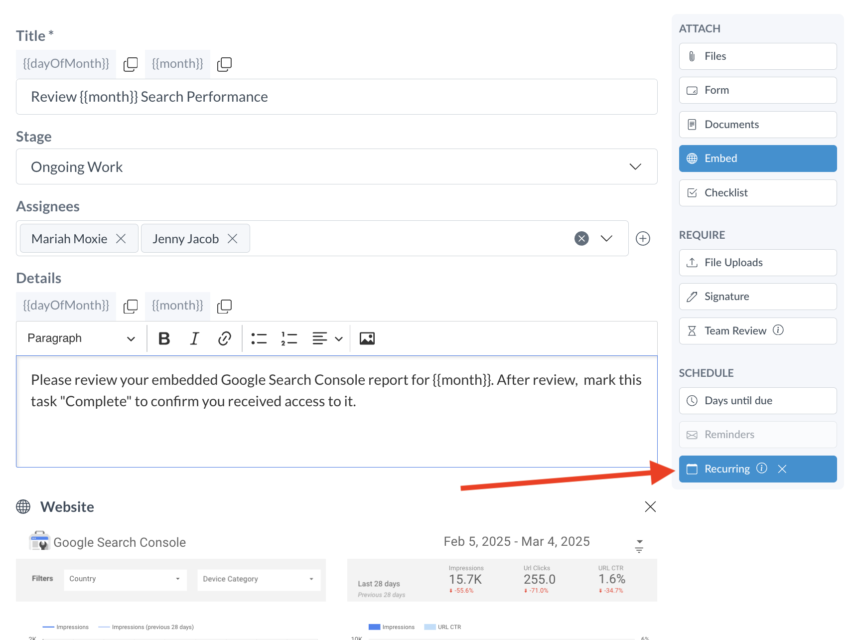 Once a task is made recurring, it will automatically be assigned to the designated client or team member at the specified intervals — saving your team time and ensuring no ongoing client needs slip through the cracks.