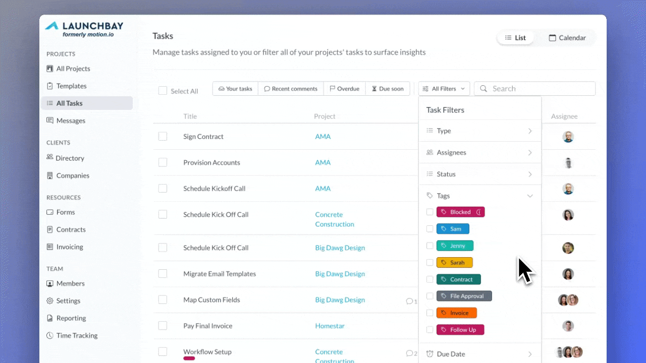 You can now filter tasks by tag in both the All Tasks view and within individual project task pages. Using the new Tags filter, LaunchBay will display only the tasks associated with the selected tag, making it faster to focus on specific types of work across projects.