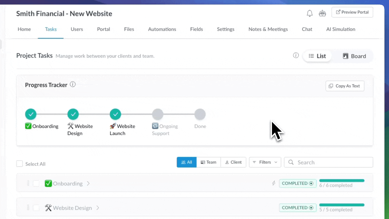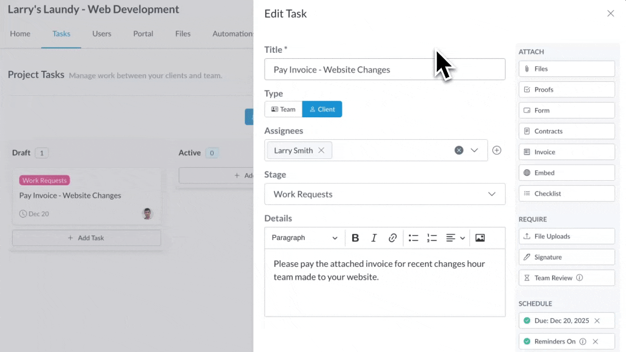 And because everything lives in the same place—tasks, client actions, and now billing—your team gets more visibility into where a project really stands. You’ll know instantly whether a deliverable is waiting on your team…or an unpaid invoice.