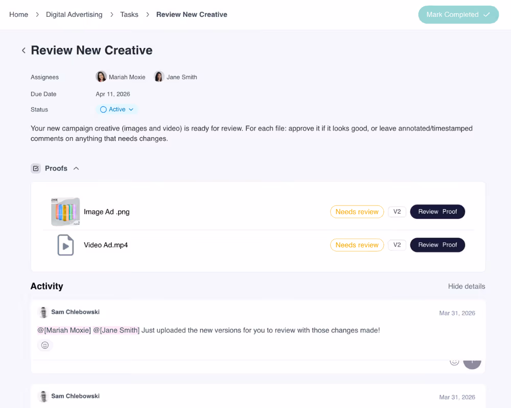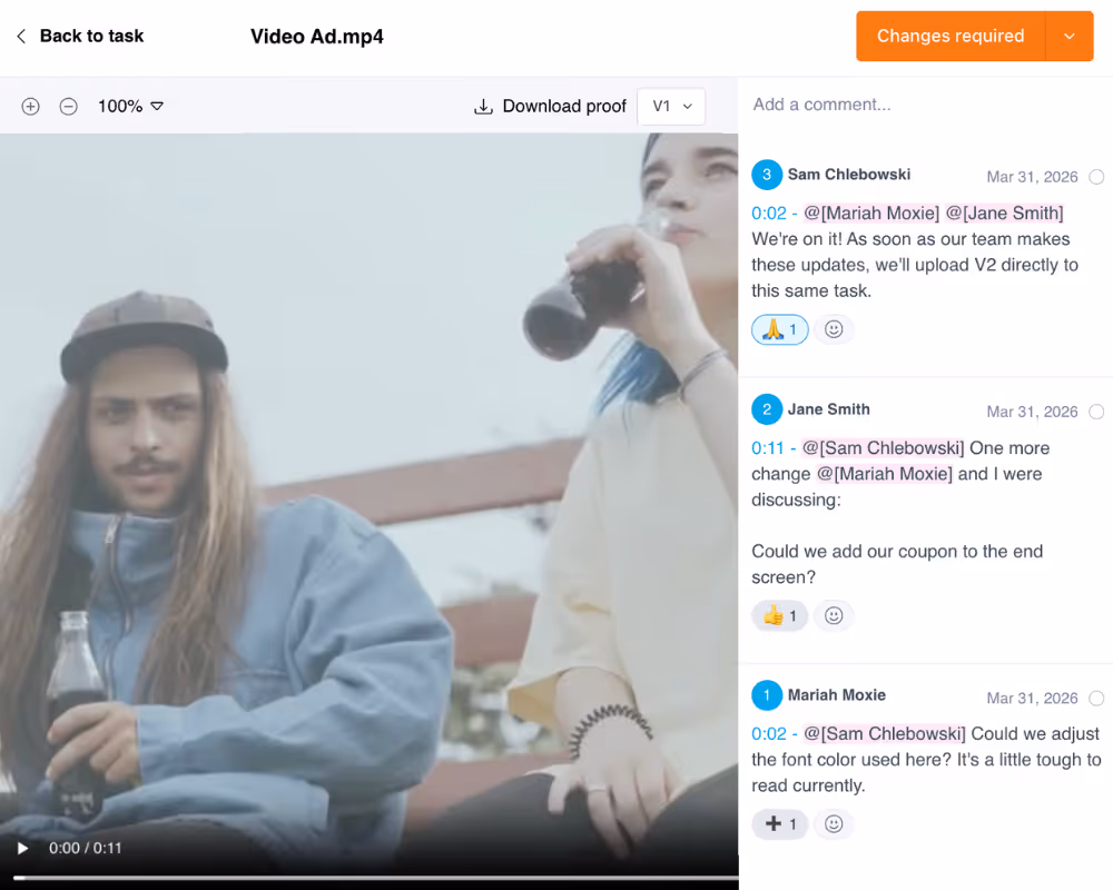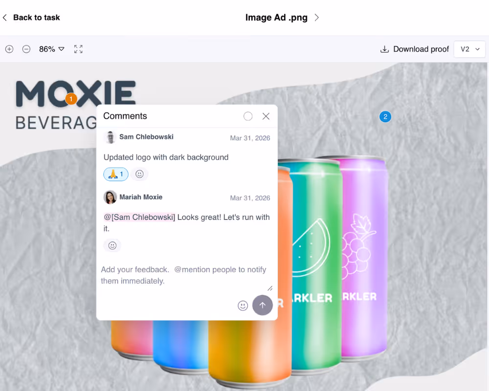 Centralize feedback on images, videos, and PDFs in a branded client portal your clients actually use. Proofing stays connected to your delivery workflow so approvals, next steps, and progress stay clear from kickoff through launch.
