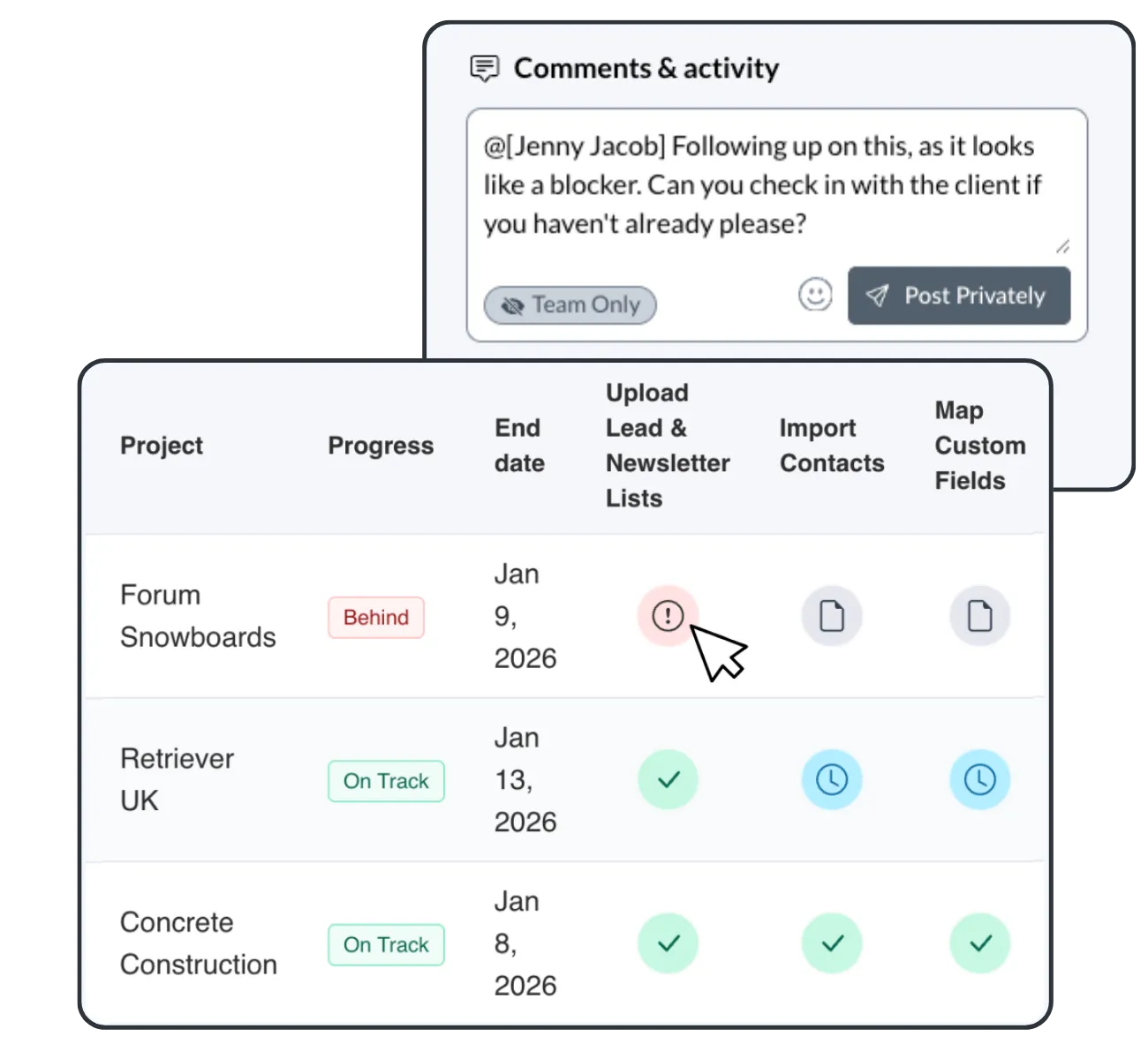 See the status of every onboarding and implementation project in one place. Understand what’s complete, what’s in progress, and what’s blocked without chasing updates.