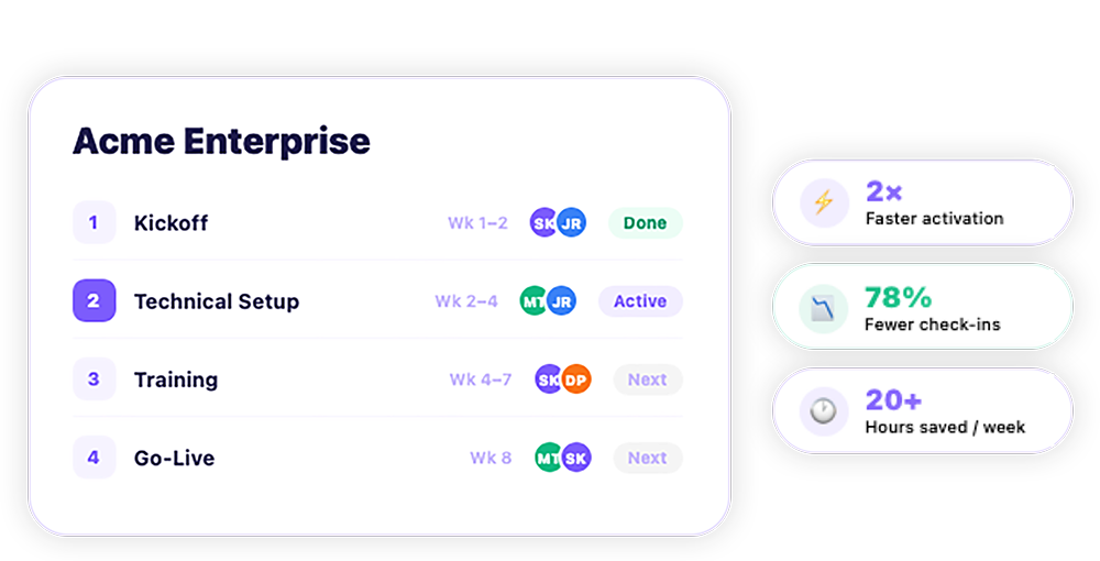 Centralize onboarding in a single, loginless portal where customers complete tasks, share assets, and stay aligned. Your CS team spends less time chasing inputs and more time driving outcomes and adoption.